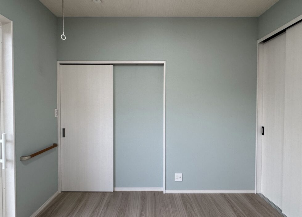 水色の壁紙にホワイトアッシュの扉が映えますね。