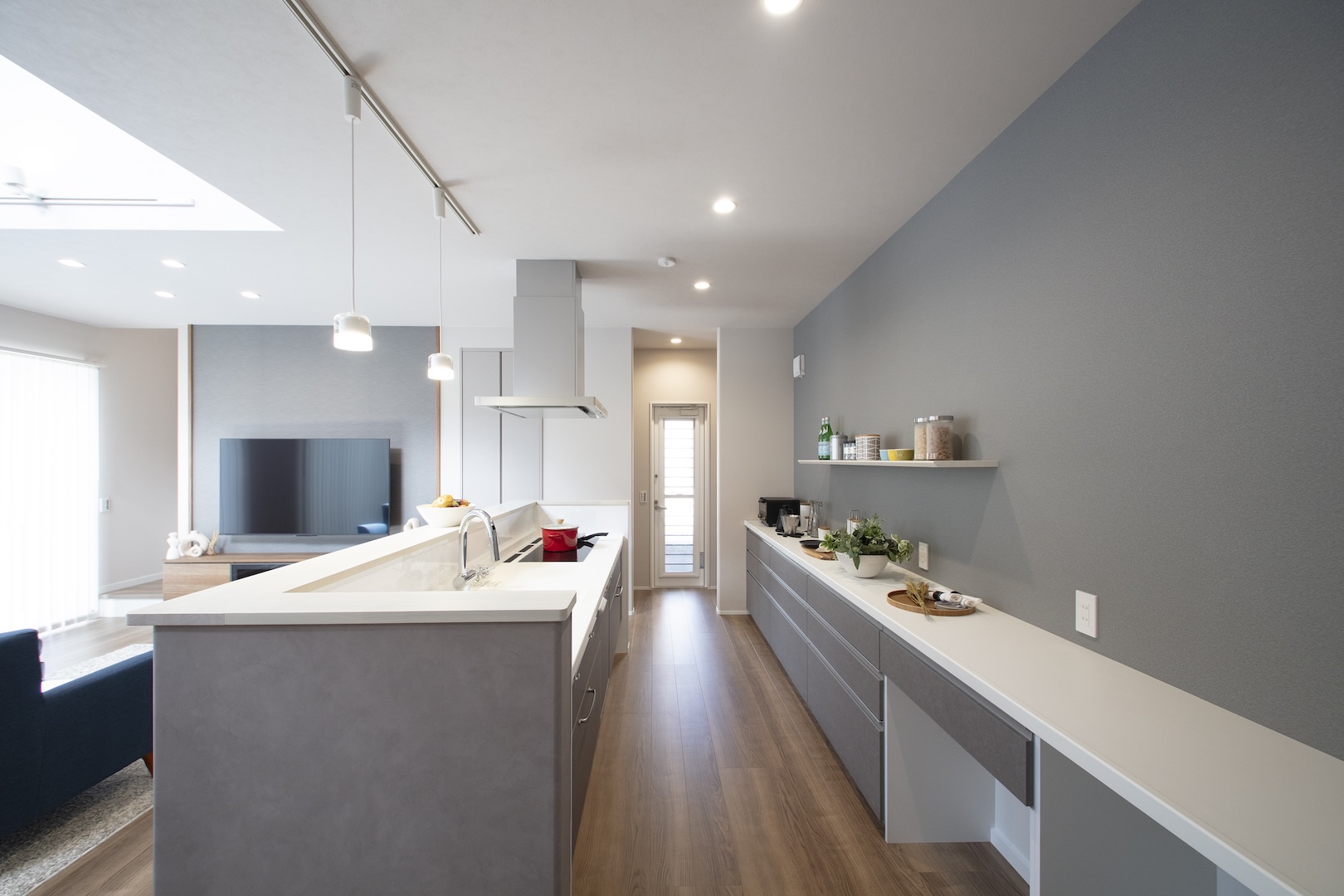 キッチンからファミリークローゼットを抜け、そのまま洗面脱衣室・お風呂へとつながる動線を採用。家事を同時進行で進めやすく、家族の日常がぐっと効率的になります。重たい洗濯物を抱えて移動するストレスも軽減され、「暮らしやすさ」をしっかりと形にしたプランです。