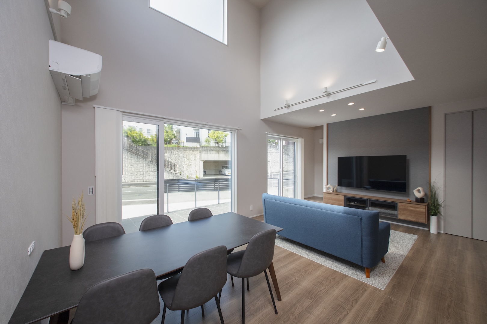 吹き抜けのあるリビングは開放感たっぷり。光と風が心地よく抜け、家族がゆったりと過ごせるリビング空間です。1階の天井高は2.5mあり、圧迫感のない伸びやかな印象を与えてくれます。