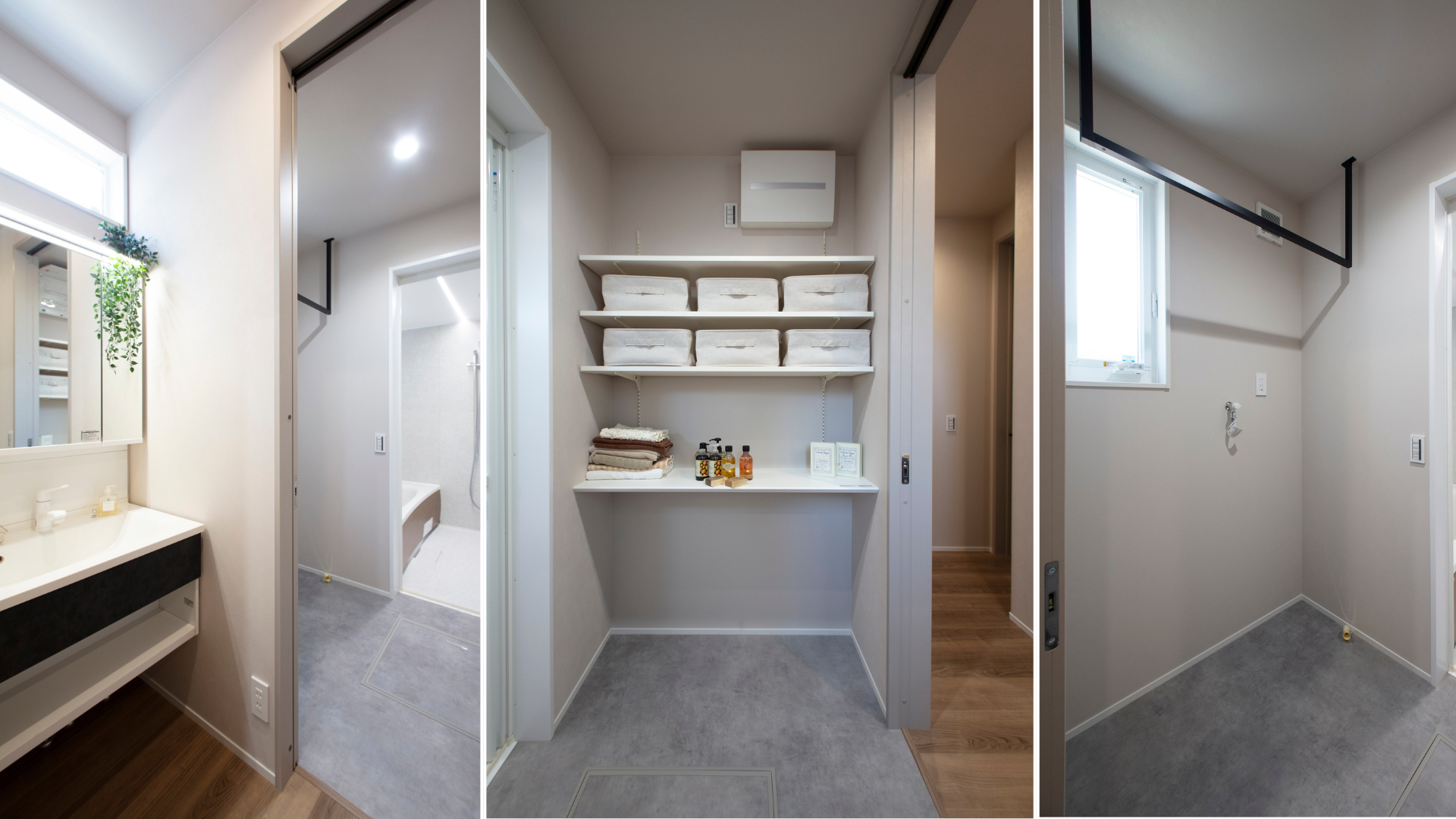 脱衣室・洗面・浴室をまとめたこのユーティリティ空間は、家族が自然に身支度を整え、洗濯や入浴をスムーズに行えることで、家の中に流れが生まれます。