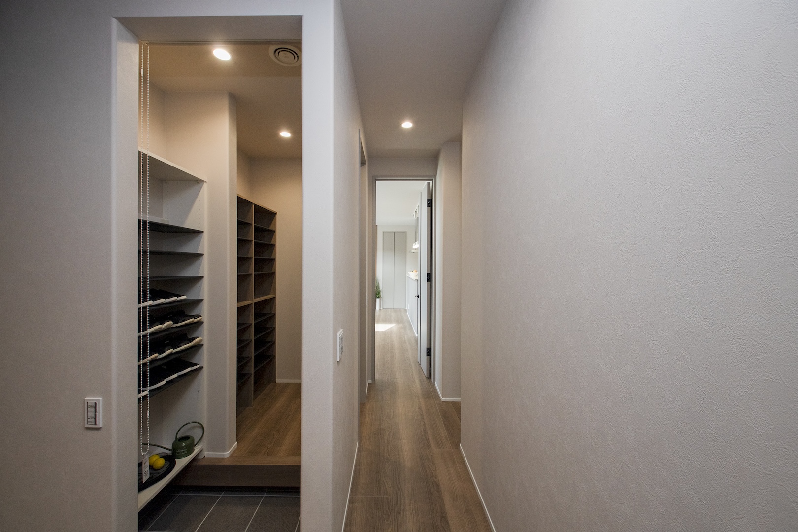 リビングが散らかる一番の原因は、帰宅時に持ち込まれるコートやカバン、郵便物など。 そこで今回のモデルハウスでは、玄関横に大容量のシューズクロークを配置し、さらにそこを通り抜けて室内に入れる「2way動線」を採用しました。