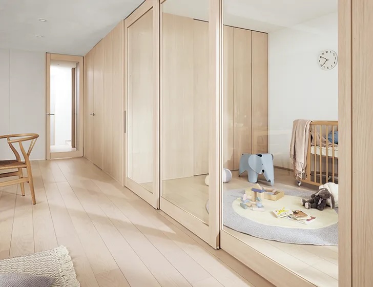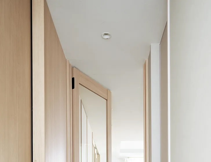 ハイドアの最大の魅力は、なんといってもその見た目です。 通常のドアの上にある「垂れ壁」がなくなるため、天井がスッキリとつながり、お部屋が実面積以上に広く感じられます。ドアを閉めているときは壁のような一体感があり、開けているときは隣の部屋とひと続きのような開放感が生まれます。